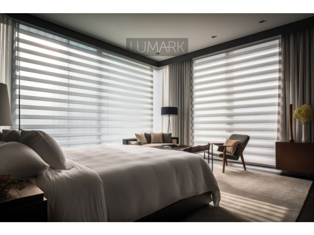 Day and night fabric roller blinds operate on the principle of two layers of fabric that either overlap with their stripes (DAY position - light enters the room through the mesh transparent part of the stripes) or, conversely, when the blind is slightly shifted, the blackout stripes align and completely cover the window (NIGHT position - the blind is not transparent). You can also set the blind for partial shading and partially lower it. Day and night blinds have become very popular in the Czech Republic in recent years, not only for their impressive appearance but also because they can completely replace curtains. The maintenance of day and night blinds is completely undemanding. We supply custom-made fabric day and night roller blinds under the brand SHADEON® in various designs. You can choose a freely hanging day and night blind or one with guide rails, or cover strips, with a cover box (which conceals the fabric roll, known as a cassette blind) or without a cover. Day and night blinds can be mounted on the window frame, on the wall, or on the ceiling. A wide selection of types and colors of fabrics for day and night blinds, including natural textures.We manufacture day and night blinds with manual operation. Careful technological processing is ensured in the production of fabric day and night blinds. We guarantee quality of production and installation.