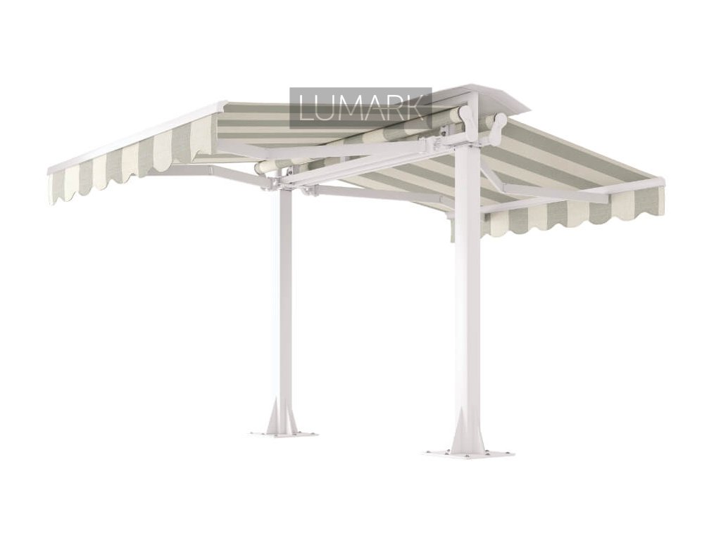 Volně stojící markýzy nabízíme se dvěmi typy výsuvných markýz upevněných na nosné konstrukci. Tato markýza je vhodná ke stínění předrestauračních zahrádek, kdy zastíní dvě strany najednou a díky tomu docílíme tak zastínění velkých ploch.