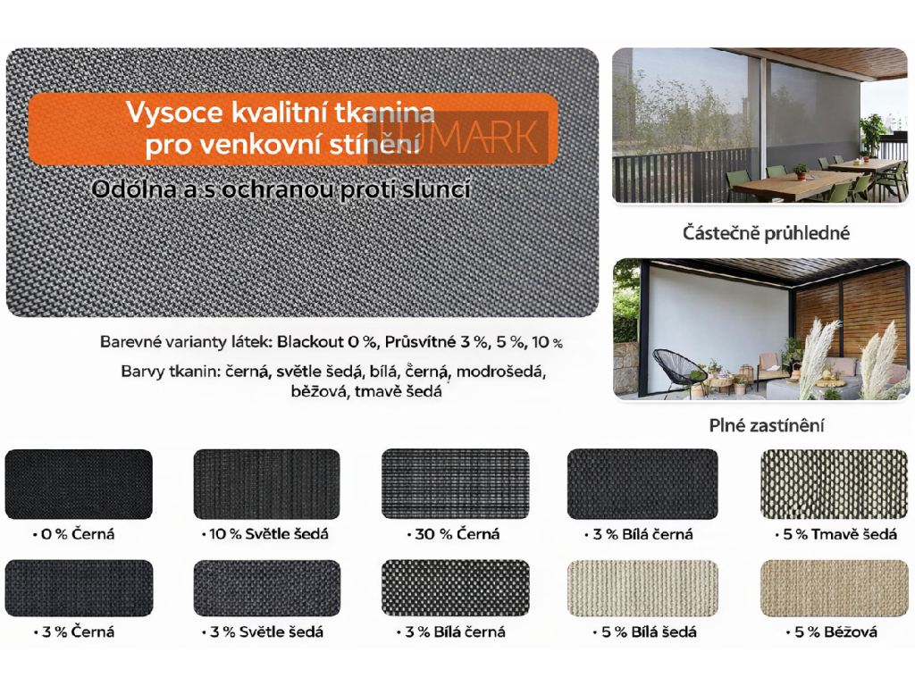 Venkovní rolety nabízíme ve variantách na míru, s možností výběru z různých typů látek, barev a stupňů zastínění. Každý projekt tak přizpůsobíme přesně vašim požadavkům.